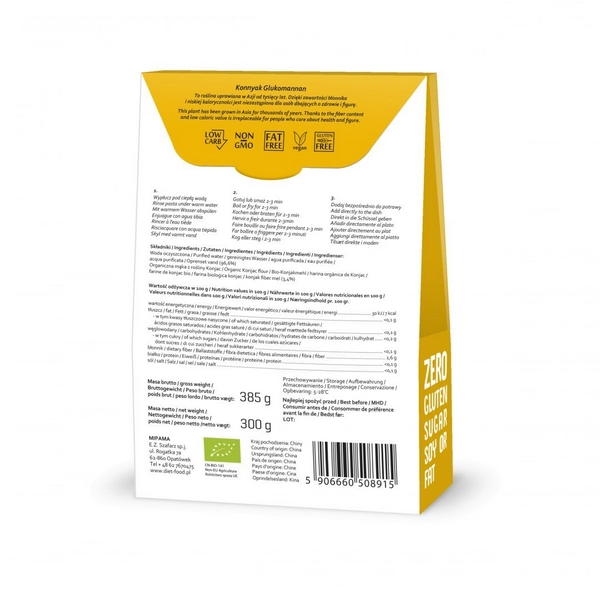 Comment consommer les pâtes Bio Shirataki Konjac ? Rincez soigneusement les pâtes sous l’eau courante tiède. Faire bouillir ou frire pendant 2-3 minutes. Ajouter directement au plat. Conserver dans un endroit sec et frais. Après ouverture, conserver au réfrigérateur dans la saumure, bien fermé, maximum 3 jours.