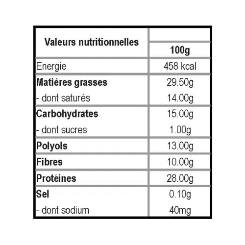 Cacao, édulcorants (maltitol, sucralose), fibres alimentaires, huile de tournesol, émulsifiants (lécithine de soja), arôme vanille.