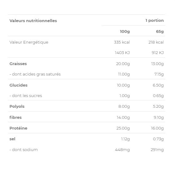 Ingrédients : Protéine de BLÉ, protéine de pois isolée, fibre d’acacia, fibre de BLÉ, protéine de riz, fibres d’AVOINE, BEURRE, huile d’olive, érythritol, maltitol, crème de cacao (protéine de pois, protéine d’AVOINE, cacao, protéine de riz, érythritol, fibre de cacao, huile d’olive, NOISETTES, huile de graines de tournesol) , émulsifiants : lécithine de tournesol, E471, sel, levure naturelle, conservateurs : sorbate de potassium, arôme vanille.