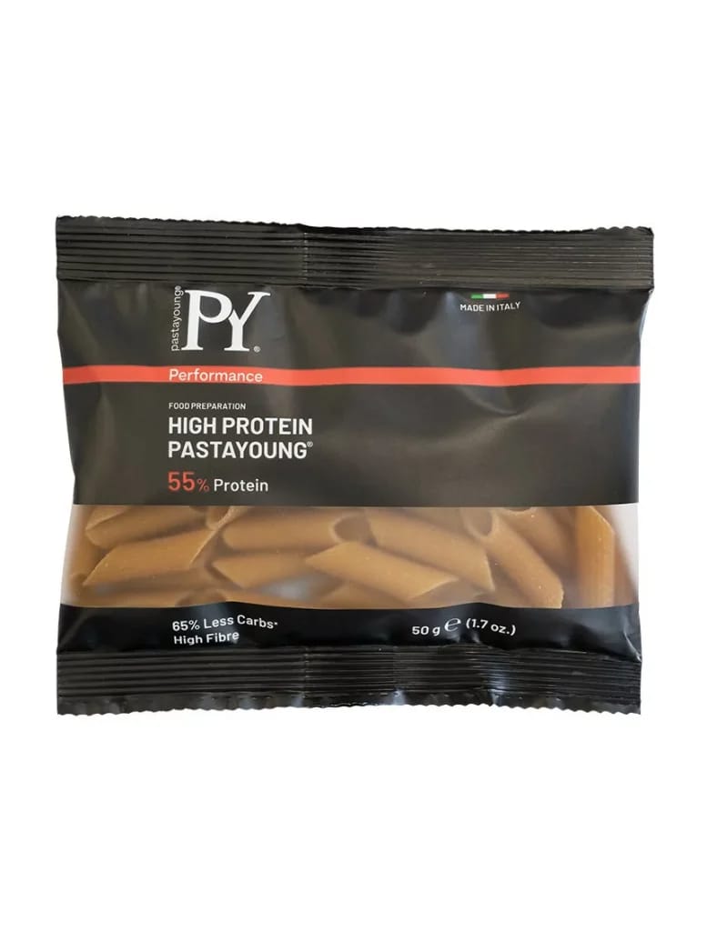 Les Penne Rigate Protéines 55 % Pasta Young 50 g proposent la même recette hyperprotéinée que le format 250 g dans un sachet portion individuelle très pratique à emporter.