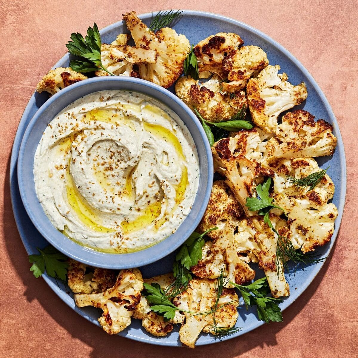 3. Pendant que le chou-fleur cuit, dans un robot culinaire, fouettez ensemble le fromage à la crème ramolli et la crème épaisse jusqu’à ce que le tout soit bien mélangé et mousseux. Ajouter la feta, l’aneth, le jus de citron, ½ cuillère à soupe de za’atar restante, ½ cuillère à soupe d’huile d’olive, 1 cuillère à café de persil haché et l’ail jusqu’à ce que le tout soit bien mélangé, en raclant souvent les côtés. Grattez dans un bol et versez 1 cuillère à soupe d’huile d’olive restante sur le dessus et servez avec le chou-fleur.